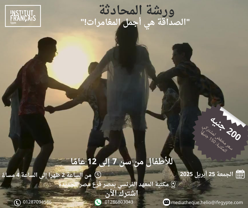 Médiathèque de l'institut français à Héliopolis ش Shafeek El-Deeb, Al Golf,, Heliopolis, Cairo Governorate, Egyptورشة الكتابة– للأطفال من 7 إلى 12 سنة الجمعة 11 ابريل 2025 من الساعة 2إلى […]